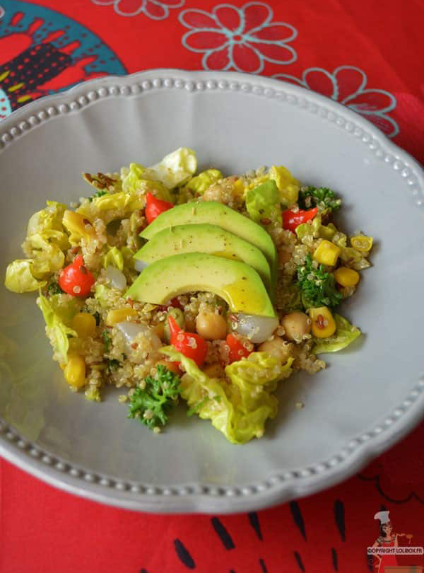 Salade composée au quinoa blanc, avocat, pois chiches, gouttes de poivrons